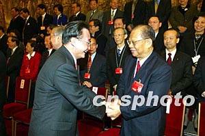 吳邦國委員長十八日下午在北京人民大會堂會見出席十屆人大一次會議的港澳代表。圖為吳邦國與香港代表吳康民握手。作者:毛建軍