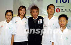 2003年全港青少年網球巡回賽將于四月全面展開,擔任該賽事代言人的香港歌星麥浚龍,三月二十五日出席此間記者會并與香港青少年網球運動員合影。潘索菲 攝