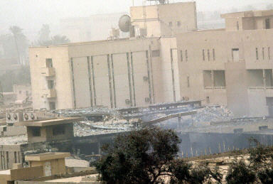 3月26日,美英聯軍再次轟炸巴格達,伊拉克國家電視臺在空襲中被炸。