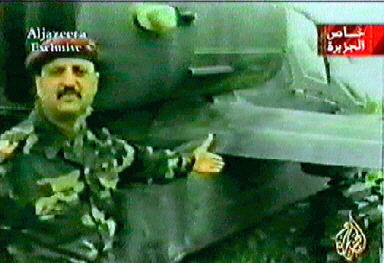 27日,美阿帕奇直升機在中幼發(fā)拉底地區(qū)被伊拉克防空炮火擊落。圖為卡塔爾半島電視臺播放的畫面,一名伊軍官在墜落的直升機前做講解。