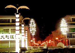 安陽的夜景不同于所看到過的其它城市,它保留著古都特有的部分“原貌”和風俗習慣——古建筑上懸掛著闌珊的紅燈籠、“酒家”懸掛的招牌在微風中飄搖,并不太平整但卻滑亮的石頭鋪就的階梯,通向那在燈光下稍微發暗的朱紅大門——你會以為這是到了唐或宋朝的哪一家官宅,但是,當你急不可待地推開這吱呀作響的朱門,展現在眼前的卻又是另一番景象:琳瑯滿目的商品擺滿了柜臺,各地的游人正在欣賞、挑揀著一個個精美的紀念品。