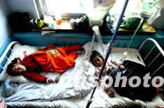 “三一九”豆奶事件后二十天,五歲的史雨平(右)與六歲的王秀文仍在海城市中心醫院打點滴。當地政府稱,自3月19日當地8所小學學生飲用豆奶以來,先后已有2500多名學生出現了腹痛、頭暈、惡心等不良反應。作者:鄭萍萍