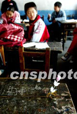 遼寧海城市鐵西小學六年級三班學生在李洋生前的課桌上擺上塑料花,表示哀悼。這是“三·一九”豆奶事件中惟一一例死亡事件,但官方稱,尚不能確定死亡原因是否和豆奶中毒有關。作者:鄭萍萍
