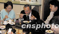 喜愛中餐的紐約市長布隆博格(左二)十六日中午在紐約華埠中餐館“糖潮食坊”宴請華裔人士,以行動回擊華埠有非典型肺炎的謠言。作者:僑報