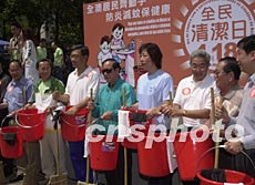 為掀起全民自覺防病熱潮,由澳門民政總署和衛生局以及街總等十一個社團機構共約三千人參加的“全民清潔日”活動十八日在澳門佑漢公園舉行啟動儀式,圖為儀式結束后,與會的政府和社團負責人帶頭參加街區的清潔衛生。李剛 攝