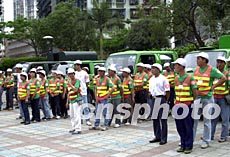 澳門十八日舉行由三千人參與“全民清潔日”活動,這是澳門近期以來舉行的最大規模的全民自覺防病熱潮,圖為民政總署的工作人員整裝待發,準備開赴各街區進行清潔衛生消毒。李剛 攝