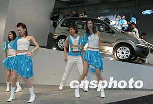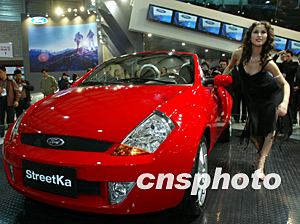 美國福特汽車公司新型跑車在美女的陪伴下十九日亮相即將開幕的第十屆上海國際汽車展覽會。作者:趙振清