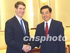 四月二十一日,中國國家主席胡錦濤在人民大會堂會見由參議院多數黨領袖比爾·弗里斯特率領的美國參議院訪華代表團。