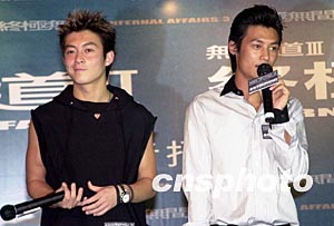 歌星余文樂、陳冠希5月2日在香港出席電影《無間道Ⅱ》及《無間道Ⅲ終極無間》新聞發(fā)布會,余文樂、陳冠希早前傳聞不和,今天兩人大方地站在一起宣傳新片。鄧慶樂 攝