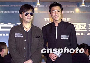影星梁朝偉、劉德華5月2日在香港出席電影《無間道Ⅱ》及《無間道Ⅲ終極無間》新聞發(fā)布會,兩位影帝將在《無間道Ⅱ》及《無間道Ⅲ終極無間》大斗演技。鄧慶樂 攝