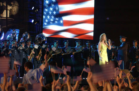 美國空軍預備軍官樂隊在哥倫比亞公司在2日錄制的特別節目“搖滾美國——向美軍致敬”中,登上杜魯門號航空母艦與獲葛萊美獎的女歌手席琳狄翁一起表演“天佑美國”。(路透)