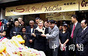 讓蔡老板開心的是今天舉行的新張儀式,聯邦參議員希拉里·克林頓成為小店新張儀式的主禮嘉賓。今天上午,希拉里與華埠人士在“絲路”咖啡屋探討振興華埠議題,在持續了數十分鐘的討論和記者會后,希拉里走到門口,拿起剪刀為咖啡屋開幕剪彩。一時間鑼鼓喧天、獅舞人笑,給冷清多日的華埠帶來了喜氣。
