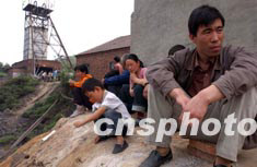 5月27日,礦工家屬在井口愁眉不展的等待救援人員返回地面。河南安陽安利煤礦5月24日發生老空透水事故,當班井下42名礦工只有27人脫險,15人被困井下。專家推測仍有生還可能,目前已有200余名救援人員先后下井搜尋。作者:慎重