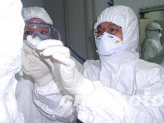 世界衛生組織視察組人員六月三日在北京解放軍小湯山醫院視察北京防治SARS病工作時,和醫護人員進行交流。作者:安然