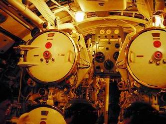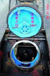 打開潛艇前部的一個(gè)艙蓋,只看到舷梯下面一片昏暗。這樣的進(jìn)出艙口,在潛艇上部共有3個(gè)。艙口的直徑也就0.6米到0.7米寬,剛剛夠一個(gè)成年人進(jìn)出。從陽(yáng)光燦爛的露天走下舷梯,眼前一團(tuán)漆黑,過(guò)了一會(huì)兒,漸漸才能看見艙內(nèi)密布的儀表、管道、閥門。原來(lái),為了節(jié)約能源和適應(yīng)水下作業(yè)的壓力,潛艇內(nèi)使用的都是光線昏黃的防爆燈,燈泡的外面還用小拇指寬的鐵條箍住。