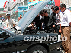 六月,北京“非典”疫情逐步得到控制,北方汽車交易市場客流量回升,十萬元左右的轎車銷路看好。圖為汽車銷售人員正在為用戶介紹國產轎車的性能。中新社記者 張勤 攝