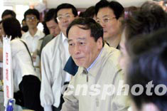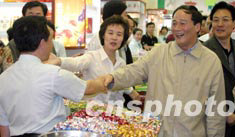 六月十三日,北京市代市長、北京防治非典型肺炎聯合工作小組副組長王岐山到位于北京王府井商業街的北京市百貨大樓視察,慰問售貨員,了解北京非典疫情平穩后的商業經營情況。中新社記者:盛佳鵬