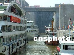 三峽工程雙線五級永久船閘昨天進行第一階段實船試驗的第二次試驗,五艘不同類型的船舶以集體進入同一閘室的方式進行實船試驗。
