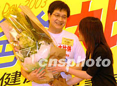 為歡度一年一度的父親節,香港時代廣場六月十五日舉行“做個健康爸爸努力保護頭家”活動,圖為一位患“非典”家屬向醫生獻上鮮花致意。錢興強 攝