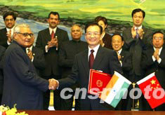 中新社北京六月二十三日電 中國國務院總理溫家寶與印度總理瓦杰帕伊二十三日晚在北京人民大會堂共同簽署了《中華人民共和國和印度共和國關系原則和全面合作的宣言》。