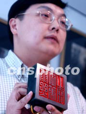 一尊清朝康熙皇帝的極品交龍紐碧玉璽“康熙御筆之寶”從海外回流,六月二十五日在北京亮相,將參加因抗擊非典推遲到七月中旬舉行的華辰春季拍賣。此璽可能在“八國(guó)聯(lián)軍”侵華時(shí)被掠出清宮,歷盡滄桑,因而今朝難以估價(jià)。中新社記者:賈國(guó)榮