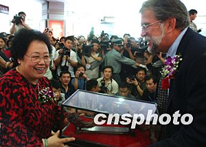 WHO駐華顧問羅伯特.帝茲接收全國政協委員、中國紫檀博物館館長陳麗華女士贈送的紫檀木雕如意,接收這份各界感謝WHO支持中國戰勝SARS病毒的心意。中新社記者:賈國榮