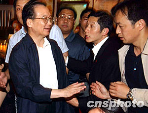 六月三十日,國務院總理溫家寶在香港新城市廣場參觀,圖為他在快餐店與市民交談。中新社記者 潘索菲 攝