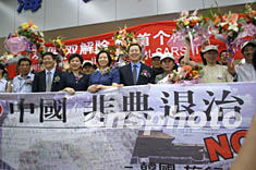 北京“雙解除”后,第一個境外旅游團6月30日抵達北京。由60名韓國各界人士組成的旅游團在北京機場向北京人民贈送“祝賀中國戰勝非典”的橫幅。中新社記者 史利 攝