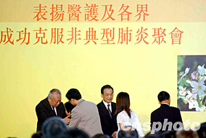 國務院總理溫家寶6月30日在香港表揚醫護人員成功克服SARS聚會上,表彰醫護界、科研界、志愿機構、政府部門和學校的代表,并慰問因公殉職的謝婉雯醫生、護士劉永佳等家人。洪少葵 攝