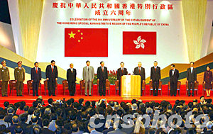 中新網7月1日電 香港特區政府今天上午在會展中心舉行盛大酒會,隆重慶祝香港回歸祖國六周年。多個民間團體也將舉辦一連串活動,祝賀及見證今日盛事。