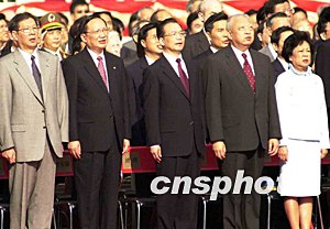 升旗儀式於八點鐘正式開始。嘹亮的國歌在人群中唱響,國旗及區旗緩緩升起,五角星與紫荊花交相輝映。溫家寶與三千多名嘉賓、制服團隊及社區人士一起,向國旗、區旗致意。這時,兩架分別懸掛著國旗和區旗的直升機在三架直升機的護衛下,從廣場上空飛過,維多利亞港灣中消防船上也噴射出高高的水花,向國旗、區旗敬禮。