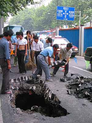 中新網7月4日電 據南京現代快報報道,昨日下午,南京新街口附近兩處路面發生塌陷。塌陷雖與地鐵建設沒有直接的關系,但給南京地鐵建設部門敲響了警鐘,負責地鐵建設的有關人士稱,在前期預防的基礎上,針對近期的梅雨,他們制定了防范措施。