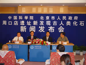 中科院負責人在會上宣布,考古人員在周口店遺址附近的田園洞出土了距今約2.5萬年的山頂洞人時期的晚期智人化石。