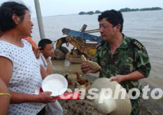 安徽省穎上縣半崗鎮空臺村的一千多名男女老少,因邱家湖七月十二日破堤行洪而被洪水四面圍困,災民們吃的是用發霉的麥子做的面餅,不少人吃后都肚子痛。圖為災民讓乘船前來看望的解放軍軍分區指揮員嘗一口這種面餅。中新社記者:賈國榮