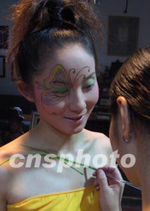 一名愛美的福州女子十八日欣然接受職業化妝師的彩繪裝扮。人體彩繪在福州成為一種時尚。作者:劉可耕