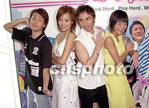 新城電臺廣播劇《都市情色》7月24日在香港舉行記者會。該劇部份演出歌星盧巧音、黃凱芹、容祖兒、葉文輝(右起)出席宣傳活動,四人于會上擺弄姿勢搞笑一番合照。作者:鄧慶樂