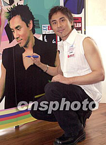 歌星葉文輝7月24日在香港出席新城電臺廣播劇《都市情色》記者會。葉文輝在宣傳海報上簽名。作者:鄧慶樂