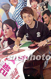 歌星黃凱芹7月24日在香港出席新城電臺廣播劇《都市情色》記者會。黃凱芹在宣傳墻報自已的肖像上簽名。作者:鄧慶樂
