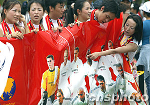 而在皇馬抵達昆明之前,就有兩位紅塔女工為了歡迎皇馬巨星,用了整整一個禮拜親手縫制二十多件印有貝克漢姆、齊達內、勞爾等舉行頭像的小T恤。今天一早,這兩位女工又隨著大部隊從玉溪趕往昆明迎接皇馬。“能夠親眼看到皇馬的球員就心滿意足了。”兩位女工的要求倒不是很高。