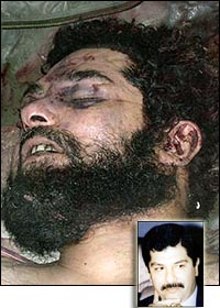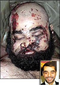 而烏代的遺容可謂慘不忍睹:眼臉因?yàn)橛傺@得浮腫并呈絳紫色,一條深褐色的傷口從其左眼一直貫穿到嘴巴右下角,光禿禿的腦門(mén)上傷痕累累,可能是被導(dǎo)彈的碎片劃傷的。最為顯然的是其前額右上方一個(gè)汩汩地向外噴涌著鮮血的彈孔,他究竟是被美軍開(kāi)槍打中的,還是自殺身亡依然是個(gè)謎。