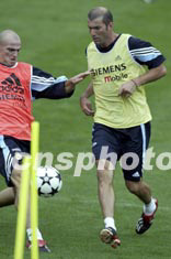 西班牙皇家馬德里足球隊二十六日下午在昆明冒雨訓練,齊達內表演嫻熟的盤帶過人技巧。中新社記者:毛建軍