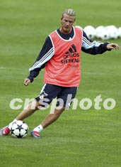 西班牙皇家馬德里足球隊二十六日下午在昆明冒雨訓練,貝克漢姆漸入狀態,展示他的腳下傳世神功。中新社記者:毛建軍