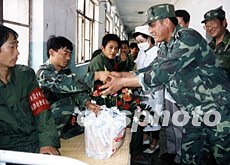 安徽省淮南軍分區指揮員來到醫院,向七月淮河抗洪中傷病住院的民兵贈送鮮花和慰問品。今夏三次洪峰過后,洪水已于七下旬日漸回落。作者:詹濤