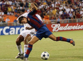 中新網(wǎng)7月31日電 在北京時(shí)間今天上午進(jìn)行的一場(chǎng)國際友誼賽中,來自西班牙的巴塞羅那隊(duì)?wèi){借著新加盟的球員夸雷斯馬和羅納爾迪尼奧的進(jìn)球,以2-0擊敗了歐洲冠軍AC米蘭隊(duì)。