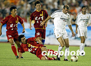 西班牙皇家馬德里足球隊與中國健力寶龍隊的比賽八月二日晚在北京工人體育場舉行。圖為龍隊隊員飛身鏟斷齊達內的帶球進攻。中新社記者:毛建軍