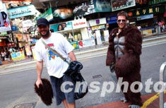 8月3日,外國游客打扮成“大猩猩”在香港時(shí)代廣場一帶消遣玩樂,引來不少途人圍觀。中新社記者:洪少葵