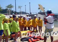 “2003年救生小鐵人培訓計劃”。由香港拯溺總會主辦“2003年救生小鐵人培訓計劃”,三日在淺水灣舉行,雖然天晴酷熱,最高氣溫約33度,但小朋卻細心聆聽導師講話。中新社記者:譚達明