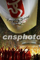 北京2008年奧運會會徽發布儀式八月三日晚在北京天壇祈年殿前廣場隆重舉行,向全世界正式發布。中新社記者:毛建軍