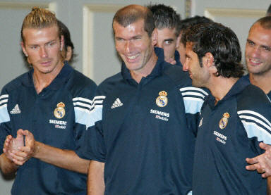 當地時間8月4日上午,日本方面為皇馬舉行了隆重的歡迎儀式,圖為貝克漢姆和齊達內等在發布會上。