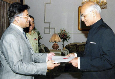 8月9日,印度新任命的駐巴基斯坦高級專員(大使)西夫·沙恩卡爾·梅農(右)向巴基斯坦總統穆沙拉夫遞交了國書。此前,在印度首都新德里也舉行了同樣的儀式。這標志著印巴兩國正式全面恢復外交關系。